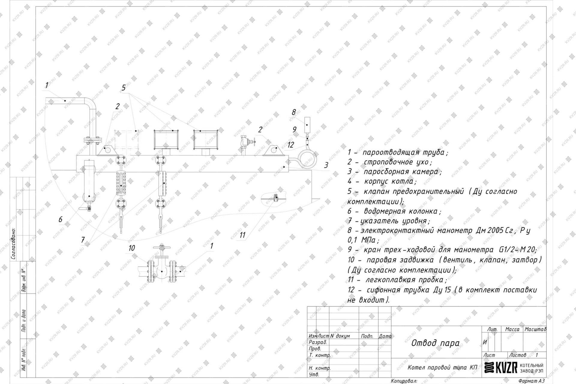 К фронтовой плите крепится воздуховод и вентилятор для подачи воздуха в топку котла под слоевую решетку. На задней крышке котла парогенератора КП 500 в основании дымовой трубы выполнен предохранительный взрывной клапан. Образующиеся в топочной камере продукты сгорания проходят конвективный пучок труб и выводятся через трубу дымовую, установленную на корпусе в хвостовой части котла. При работе круглый парообразователь КП 500 подпитывается водой для образования пара через штуцер. Подпитка котла ведется из питательного бака насосом через соединительную арматуру. На трубопроводе подпитки котла водой должно быть установлено запорное устройство и обратный клапан. Запорное устройство располагается между паровым котлом КПр 500 и обратным клапаном.