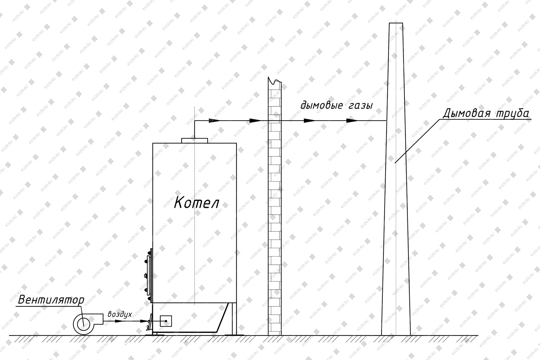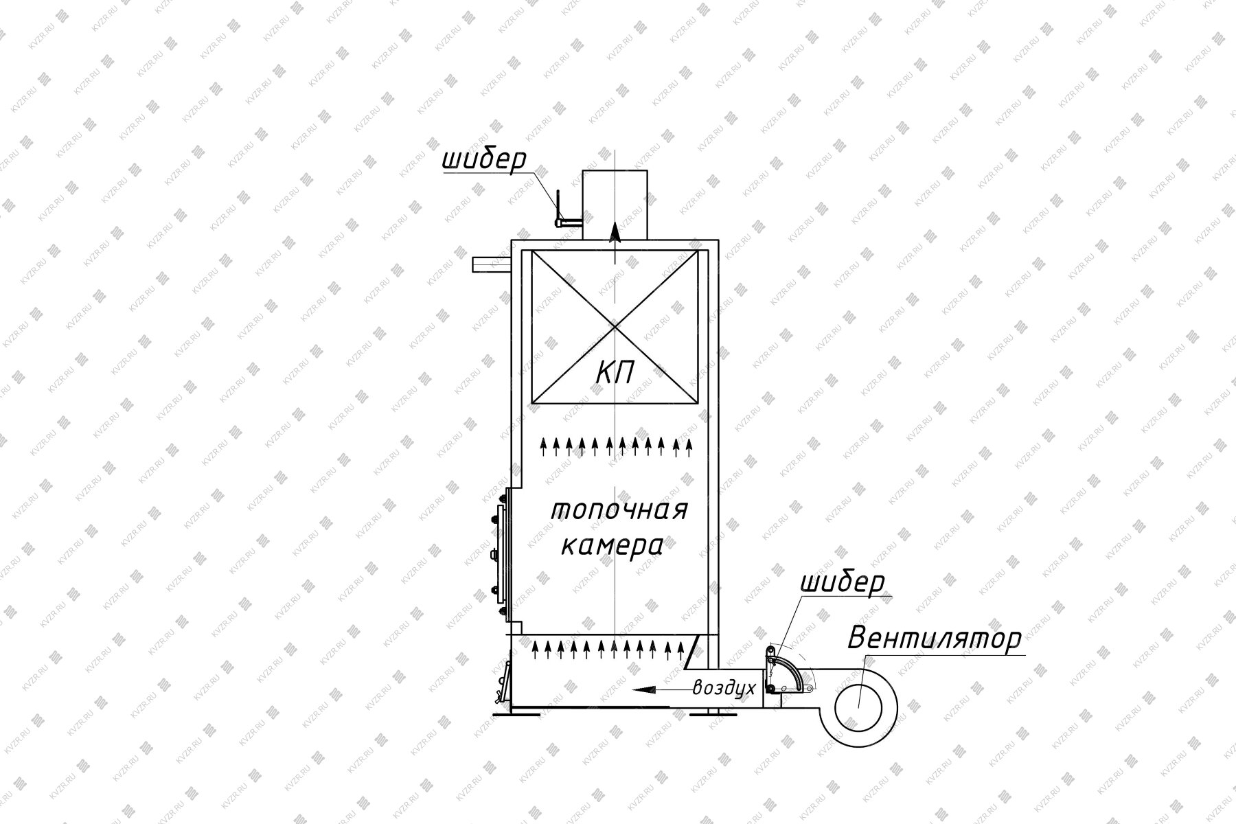 Вентилятор и воздуховод для подачи воздуха на горение с шибером, поставляемый в комплекте, устанавливается по месту на монтаже в соответствии с планом расстановки оборудования по проекту котельной. Врезается подающий воздуховод в топочный короб под слоевой решеткой по месту исходя из особенностей расстановки оборудования.