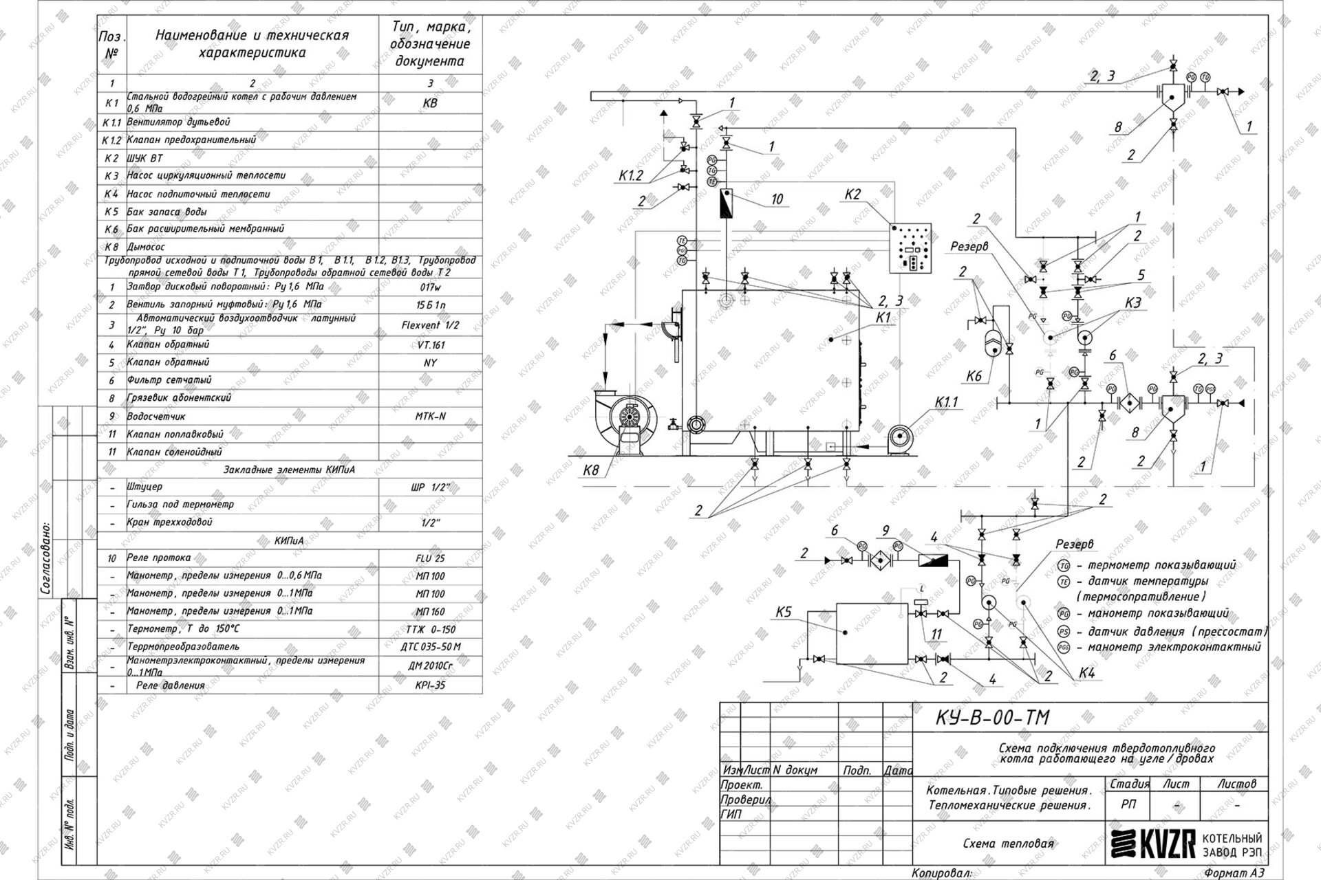 Образец тепловой схемы подключения котла 0.6 МВт уголь дрова и вспомогательного оборудования в котельной приведен на данной схеме. При эксплуатации очень важно грамотно осуществить подключение оборудования, установить все контрольно измерительные приборы, для контроля параметров работы котельной и запорную арматуру для оперативного переключения потока теплоносителя при плановой или аварийной остановке оборудования. Данную схему можно использовать как пример для разработки под свой объект или заказать у нас разработку индивидуальной схемы для вашей котельной.