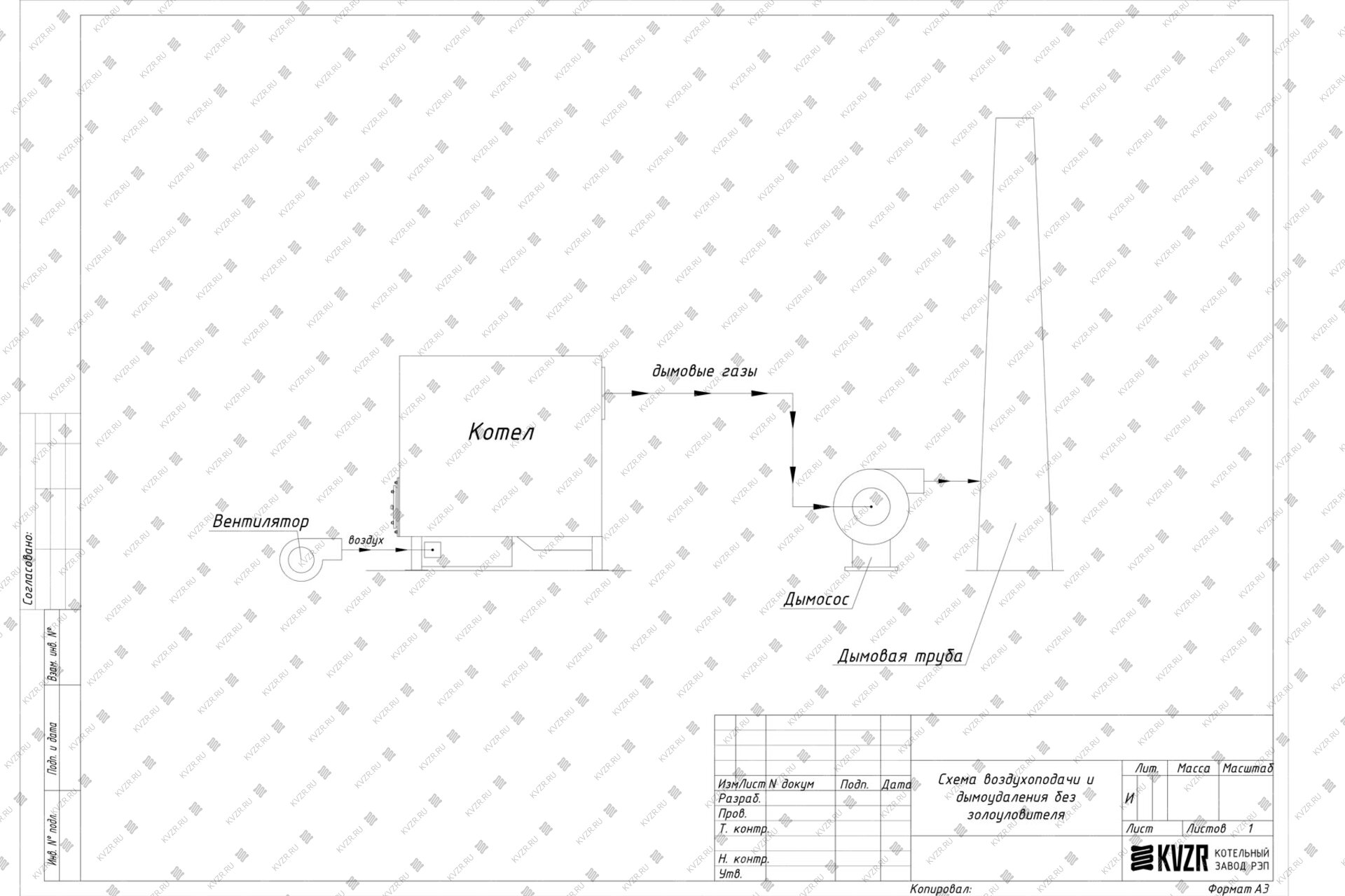 Если вам не требуется высокая очистка дымовых газов, котел может работать без золоуловителя. Схема подключения при этом следующая - дымовые газы выходят из котла в газоходы котельной, затем в дымосос и далее снова по газоходам в дымовую трубу. В зависимости от компоновки котельной дымосос может устанавливаться как в котельной, так и на улице. Наш завод производит газоходы и переходники к ним. Получив схему вашей котельной мы можем изготовить для вас комплект газоходов, переходников нужных размеров и сечений. На месте такие детали собираются как конструктор. Обращаем ваше внимание, что газоходы требуют изоляции, для защиты персонала от ожогов, так как уходящие газы имеют высокую температуру, а на улице газоходы требуют изоляции для избежания образования конденсата.
